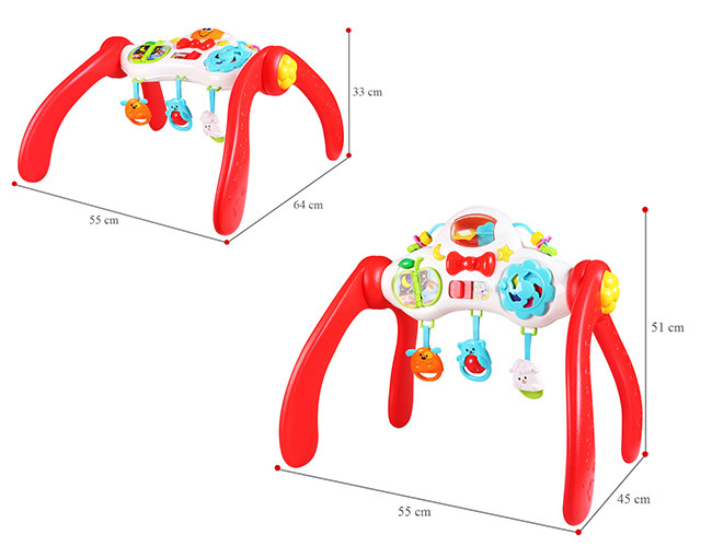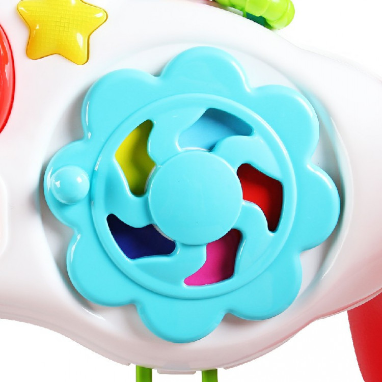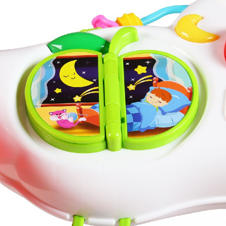 - Mặt đồ chơi được gắn vào rất nhiều món đồ chơi xinh xắn như cuốn sách, bánh xoay hình cánh quạt, ô cửa sổ Bé có thể lựa chọn nhiều cách chơi để vận động tay nhiều hơn thông qua các thao tác: gạt, lật, xoay, ấn,
