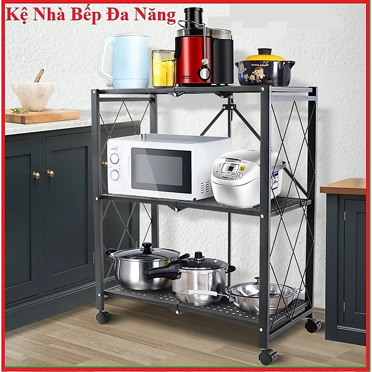 Kệ đa năng gấp gọn 3/4 tầng bằng Thép Carbon không gỉ, Kệ lò vi sóng có bánh xe, kệ sách trang trí