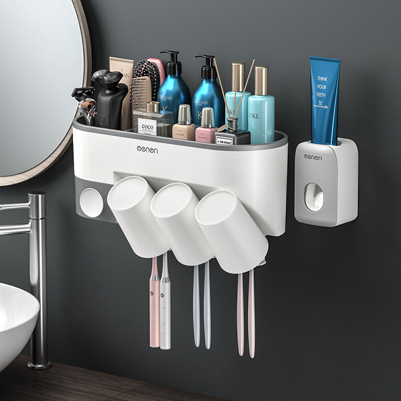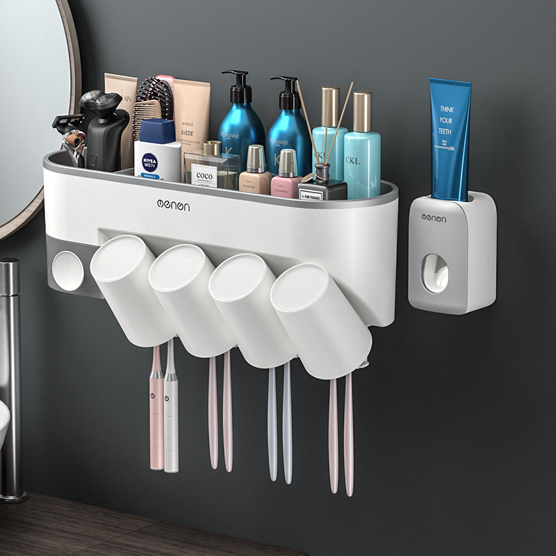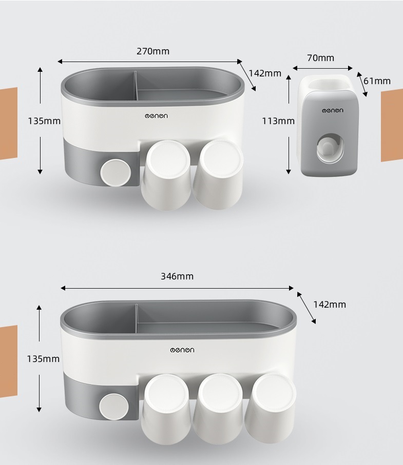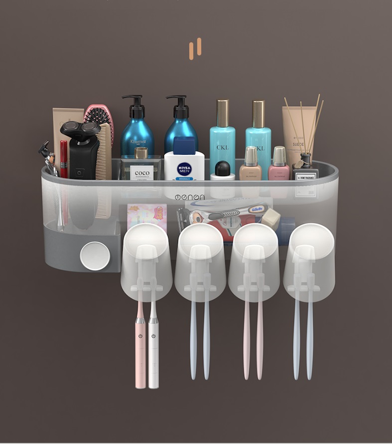- Sản phẩm bao gồm: 1 Kệ nhà tắm tích hợp chức năng lấy kem tự động + Cốc hút từ tính + Miếng dán tường