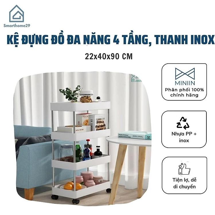 Kệ Để Đựng Đồ Đa Năng 4 Tầng - Thanh Inox - Giá Nhựa có lỗ Cao cấp[CÓ BÁNH XE] màu trắng - Hàng Loại 1 - Chính Hãng MINIIN