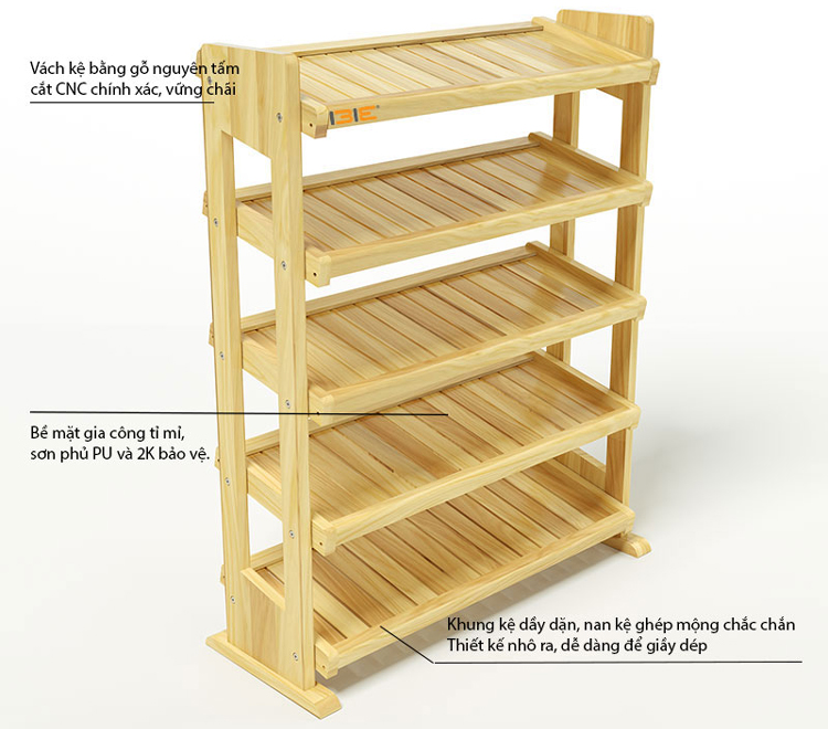 - Khung kệ được làm từ gỗ cao su dày 20 ly đã qua xử lý chống cong vênh mối mọt. Các nan gỗ lớn được ghép mộng và gia cố thêm bằng đinh vít, vừa đảm bảo thẩm mỹ vừa sử dụng lâu bền. Khoảng cách giữa các nan là 5 ly, đảm bảo không lọt gót giày cao gót mà vẫn dễ dàng vệ sinh.