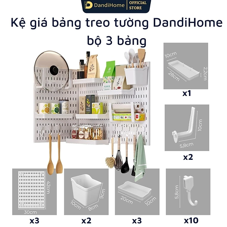 Kệ giá bảng treo tường DandiHome trang trí pegboard để đồ decor bàn học, phòng bếp, nhà tắm, đã kèm đầy đủ phụ kiện, có thể dán kính không cần khoan đục