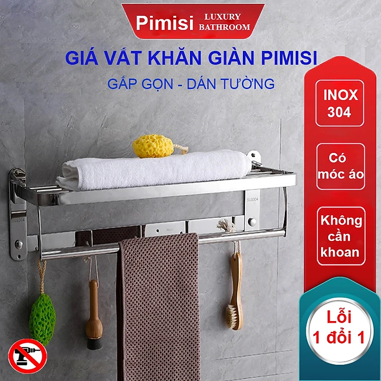 Kệ giá treo khăn tắm dán tường trong nhà vệ sinh Pimisi PR-011WM inox 304 giàn đa năng có kèm keo dán | hàng chính hãng