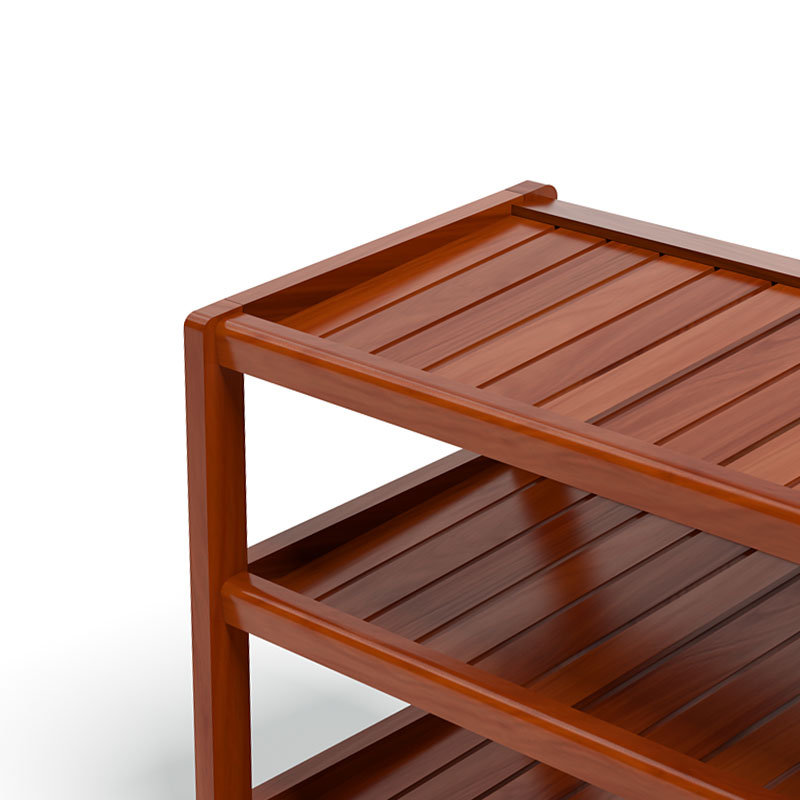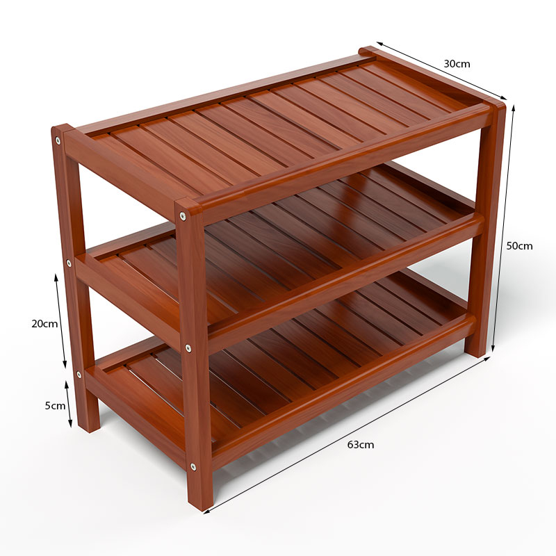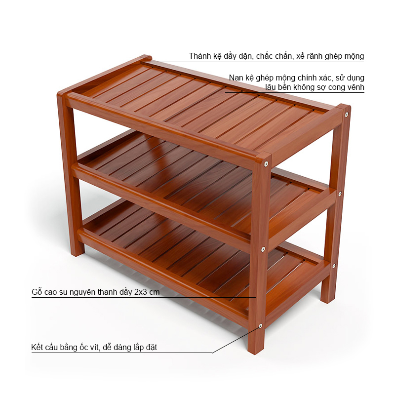 Khung kệ được làm từ gỗ cao su dầy 20 ly đã qua xử lý chống cong vênh mối mọt. Các nan gỗ lớn được ghép mộng và gia cố thêm bằng đinh vít, vừa đảm bảo thẩm mỹ vừa sử dụng lâu bền. Khoảng cách giữa các nan là 5 ly, đảm bảo không lọt gót giầy cao gót mà vẫn dễ dàng vệ sinh.