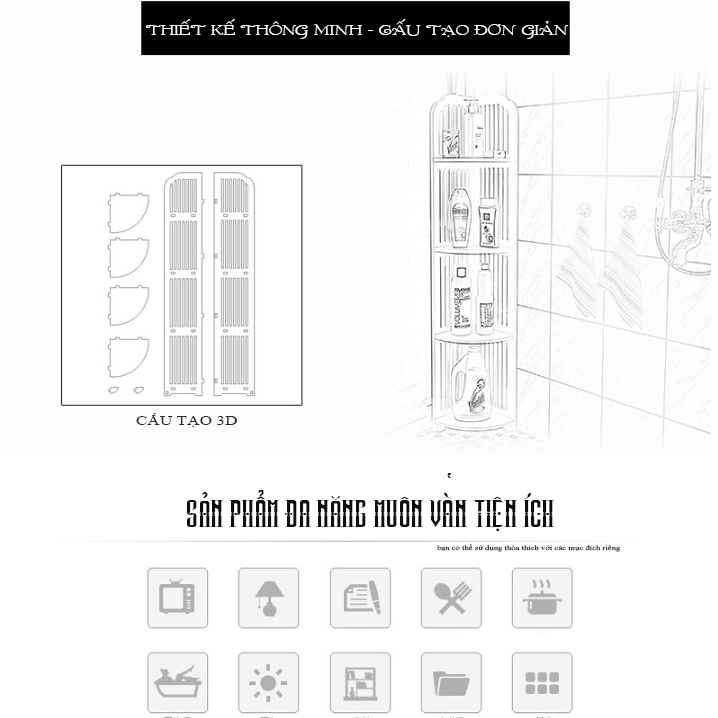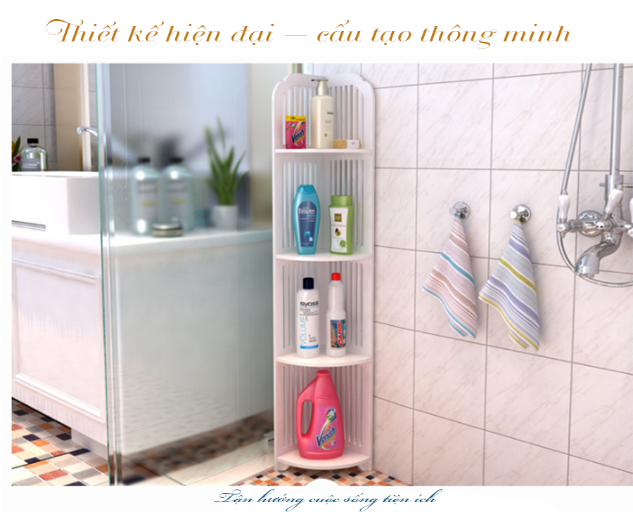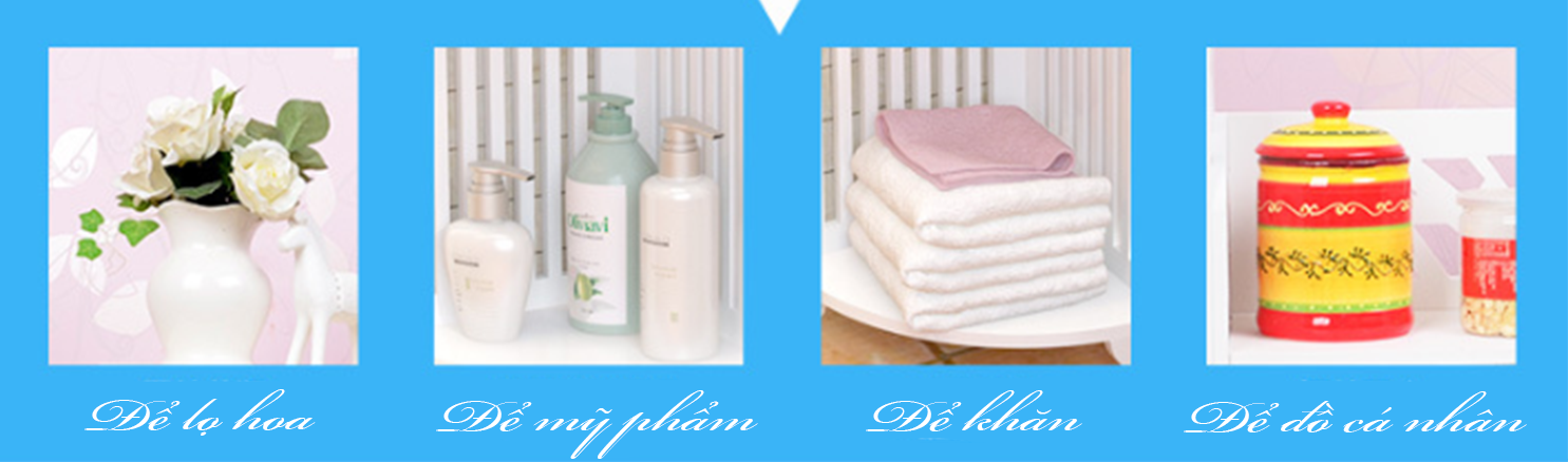 - Công năng: Giúp bạn sắp xếp lại đồ dùng gọn gàng, không gian sống tuyệt vời hơn. Bạn có thể đặt kệ trong phòng tắm, phòng ngủ, phòng khách, tại shop, spa,