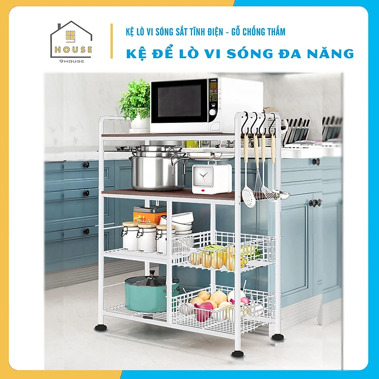 Kệ lò vi sóng đa năng 179-2 thương hiệu 9House kệ bếp để lò nướng nồi cơm điện kèm giá rổ để rau củ gia vị loại khung sắt dày sơn tĩnh điện chống rỉ mặt gỗ MDF lõi xanh chống ẩm bề mặt phủ melamine chống thấm cao cấp - Hàng chính hãng