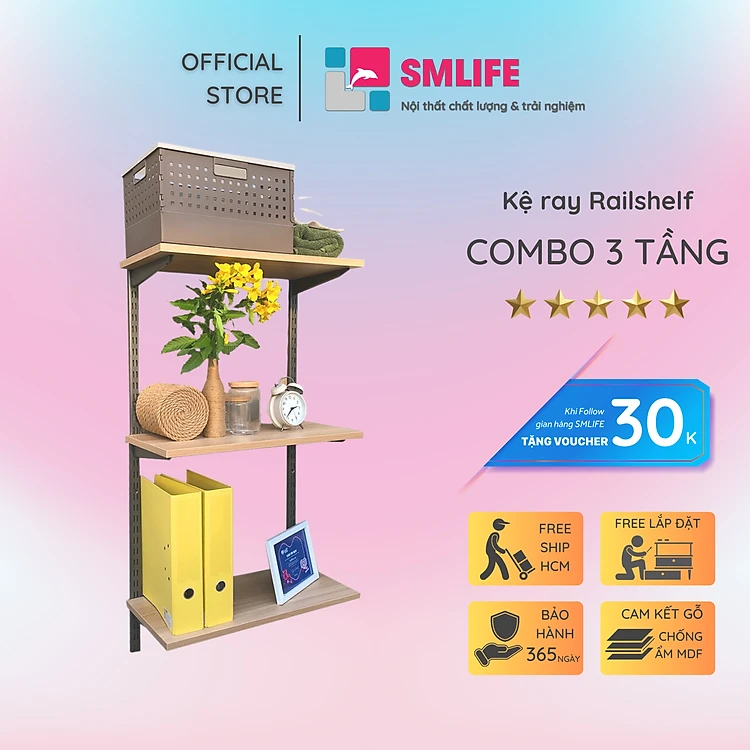 Kệ Railshelf 3 tầng H120cm - Kệ treo tường tùy biến kích thước & vị trí hiện đại