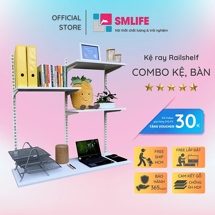 Kệ Ray Tường SMLIFE Railshelf Kiêm Bàn Làm Việc RTH120 - Kệ Treo Tường Tùy Biến Kích Thước & Vị Trí Hiện Đại Cho Căn Hộ Nhỏ