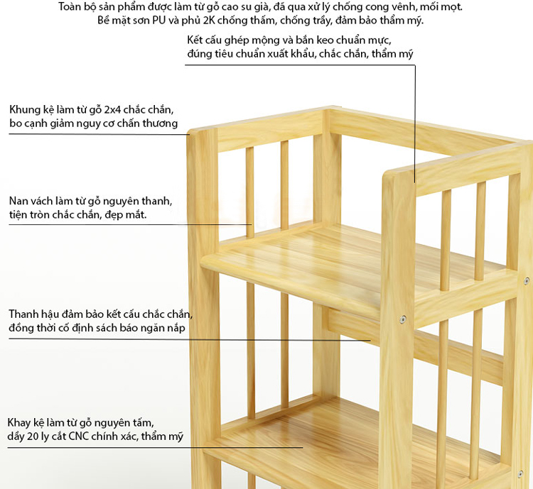 • Khung kệ được làm từ gỗ cao su già nguyên thanh, dày 2x4cm vô cùng chắc chắn, cân bằng và ổn định. Các mối ghép làm bằng mộng và bắn keo khít khao, đẹp mắt, không một vết đinh, đápđáp ứng tiêu chuẩn gắt gao của hàng xuất khẩu.