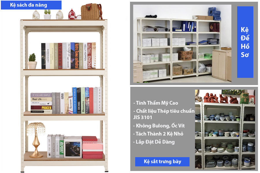 Trong phòng khách, kệ 2 trong 1 có thể là một chiếc kệ sách xinh xắn chứa được những loại sách dày nặng. Trong không gian bếp sẽ là một chiếc kệ bếp gọn gàng không gỉ sét. Hay biến hóa thành một kệ trưng bày sản phẩm trong cửa hàng mỹ phẩm, thời trang … Ngoài ra, kệ hồ sơ văn phòng sẽ là một lựa chọn hợp lý để lưu trữ hồ sơ gọn gàng, giúp việc tìm kiếm tài liệu trở nên dễ dàng.