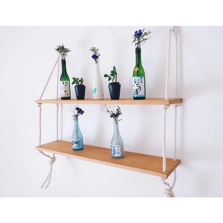 Kệ gỗ dây thừng 2 tầng treo tường retro, vintage phù hợp để làm kệ sách, kệ treo trang trí phòng làm việc, phòng tắm, phòng ngủ, quán cafe và homestay,… Chiếc kệ treo tường bằng dây thừng sẽ làm cho không gian căn phòng trở nên độc đáo và thu hút hơn.