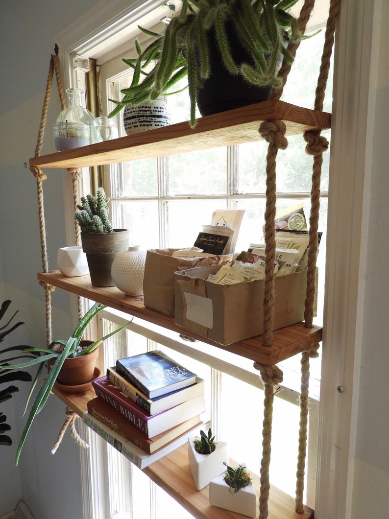 Kệ trang trí cũng có thể thỏa sức sáng tạo các loại kiểu dáng treo khác nhau, các bạn cũng có thể tạo hình cho kệ bằng thắt dây thừng theo nhiều hình dáng hoặc thay đổi màu sắc của dây để cho không gian thêm phần sinh động và độc đáo