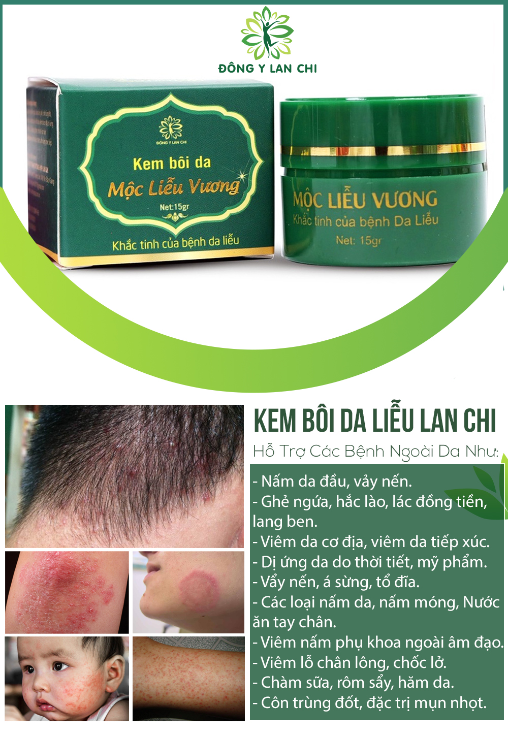 Kem bôi da liễu Mộc Liễu Vương Lan Chi được chỉ định dùng cho các triệu chứng: Chàm, Lang ben, hắc lào, lác đồng tiền, nấm ngứa, viem da cơ địa, côn trùng đốt, viem lỗ chân lông, nứt nẻ chân tay, nứt nẻ đầu ti, nấm móng nấm da đầu, viem tuyến vú, da dị ứng, nấm da,….hỗ trợ khắc phục được hầu hết các bệnh ngoài da, ngứa bộ phận sinh dục,…