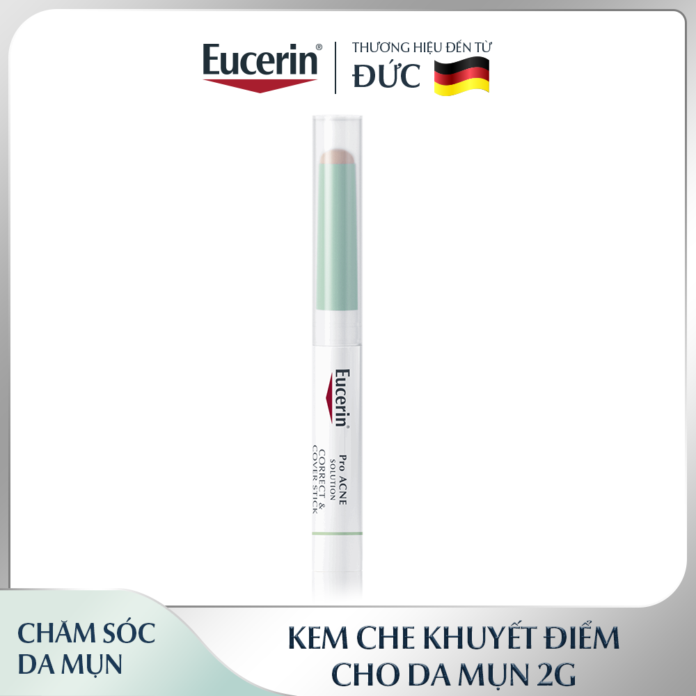 Bút che khuyết điểm Eucerin ProAcne Correct & Cover Stick giúp che khuyết điểm 2 trong 1, với thành phần chính là Salicylic Acid giúp giảm mụn, lại còn giúp “che đi” làn da không đều màu do thâm mụn hiệu quả. Sản phẩm có thể sử dụng đồng thời với các liệu pháp giảm mụn khác và có thể sử dụng cho phụ nữ mang thai
