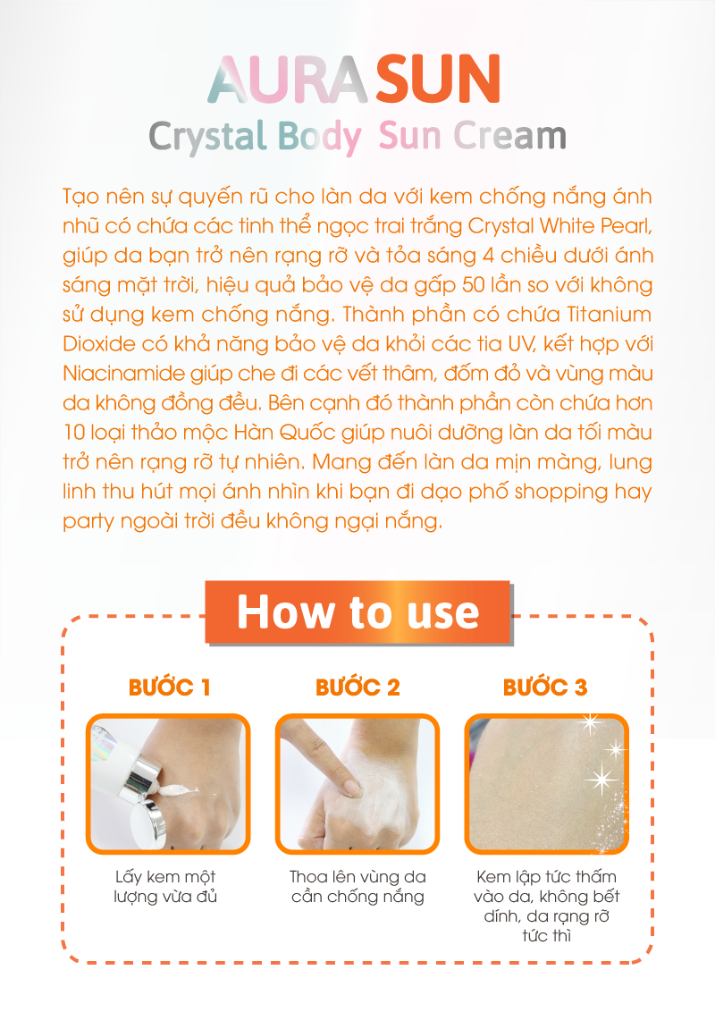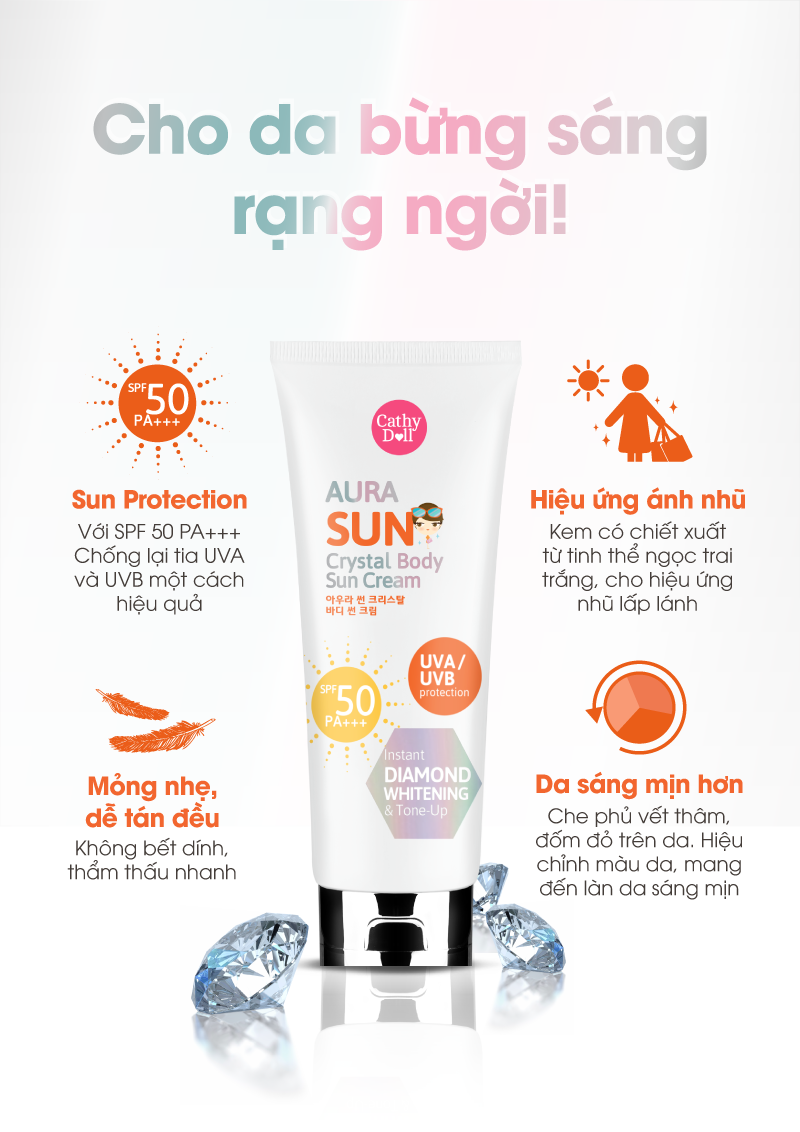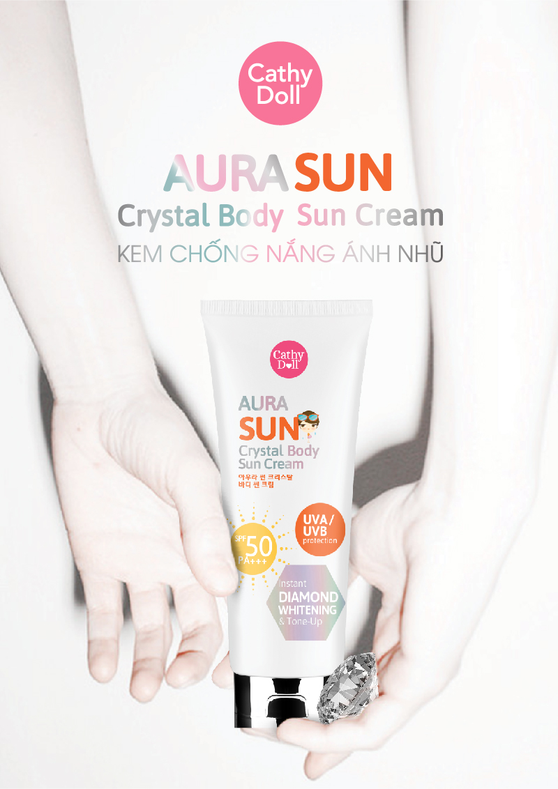 Kem Chống Nắng Ánh Nhũ Cathy Doll Aura Sun Crystal Body Sun Cream SPF50 PA+++ chứa chiết xuất tinh thể ngọc trai trắng Crystal White Pearl giúp làn da bạn trở nên rạng rỡ với lớp aura 4 chiều khi tiếp xúc với ánh nắng mặt trời, bảo vệ chống lại ánh nắng gấp 50 lần