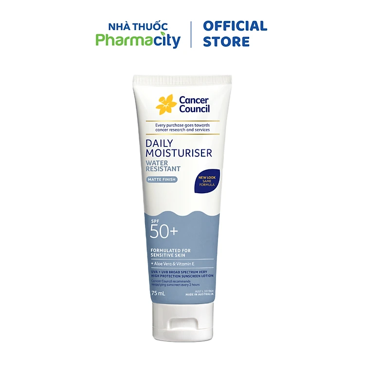 Kem Chống Nắng Cancer Council Daily Moisturiser Watter Resistant Kháng Nước, Dưỡng Ẩm SPF50+ (Tuýp 75ml)