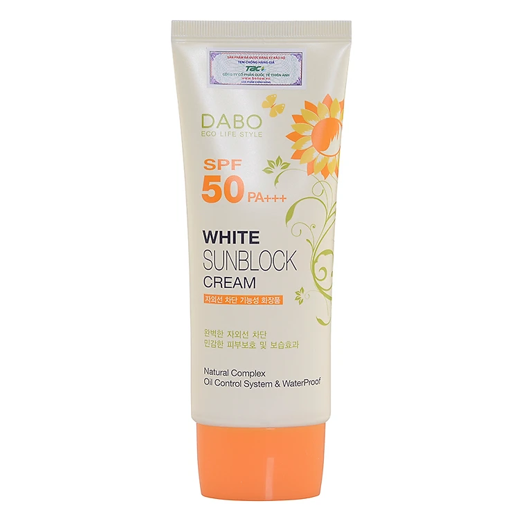 - Kem Chống Nắng Dabo White Sunblock Cream SPF50 với công thức ưu việt vượt trội tác dụng nổi bất là bảo vệ da khỏi bị đen, sạm, cháy nắng, nám, tàn nhang và lão hóa do ánh nắng mặt trời, đặc biệt là khả năng ngăn chặn tác hại của tia UVA và tia UVB đối với da.
