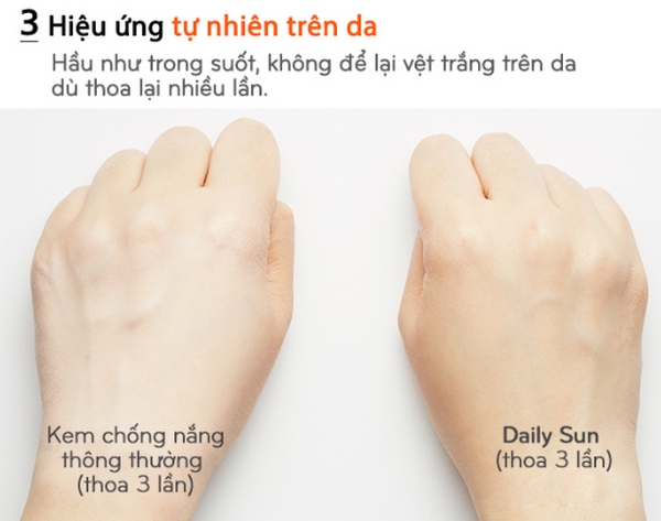 -Hiệu ứng trên da thì rất tự nhiên luôn nha, bạn có thể thoa lại nhiều lần để hiệu quả chống nắng được tốt hơn. Nhưng yên tâm là Missha All Around Safe Block Daily Sun SPF50+/PA++++ sẽ không để lại vết trắng đâu nha.