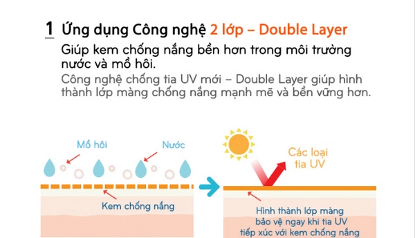 -Ứng dụng công nghệ 2 lớp Double Layer giúp hình thành lớp màng chống nắng mạnh mẽ và bền vững hơn. Kể cả trong môi trường nước và mồ hôi.