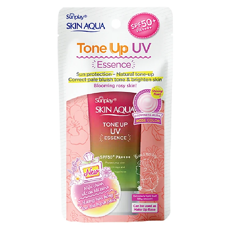 Kem chống nắng nâng tông Skin Aqua Tone up Rose cho da trắng, khuyết điểm xanh hoặc tái xanh, dạng tinh chất Sunplay Skin Aqua Tone Up UV Essence Happiness Aura (Rose) SPF 50+ PA++++ 50g