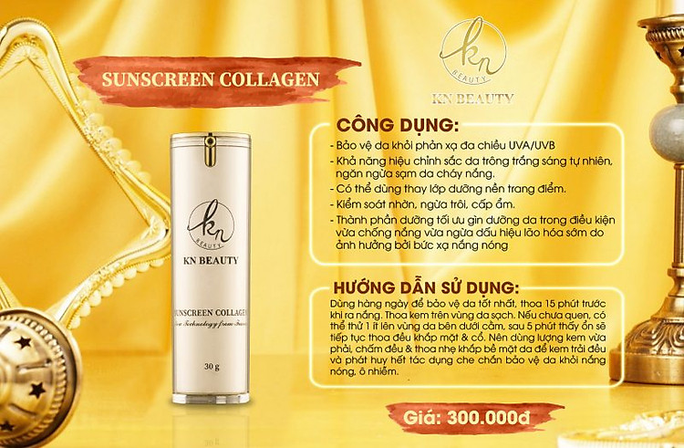 Kem chống nắng Kn Beauty được nghiên cứu tạo nên từ công nghệ Geltrap tiên tiến của PHÁP đặc biệt bởi lớp màng bảo vệ gìn dưỡng da tối ưu trong mọi điều kiện, phản xạ đa chiều UVA/UVB tránh da mất nước, kiểm soát nhờn & ngừa trôi hoàn hảo, Cấu trúc kem siêu mềm mượt nhẹ nhàng tương thích với mọi loại da, Thành phần Collagen và dưỡng chất tối ưu giúp da được nuôi dưỡng sâu, ngăn ngừa các dấu hiệu lão hóa sớm.