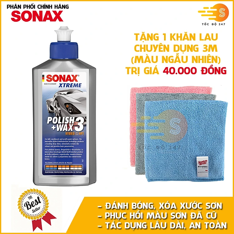 Kem đánh bóng, xóa xước và bảo vệ sơn xe ô tô 3in1 Sonax 202100 250ml - Tặng 1 khăn lau 3M màu ngẫu nhiên - phục hồi sơn cũ, xóa vết xước nhỏ và bảo vệ sơn xe toàn diện