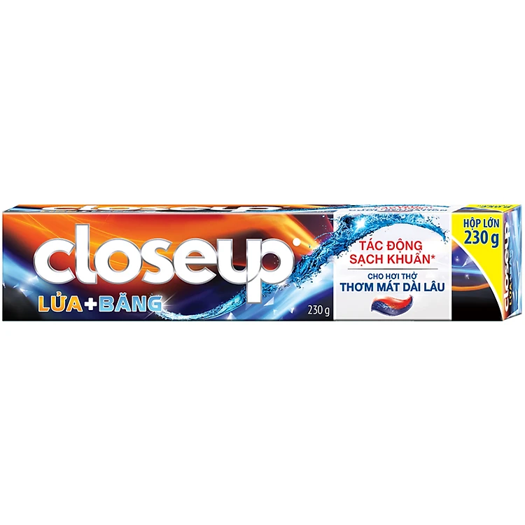 - Kem Đánh Răng Closeup Lửa Băng (230g) với lõi kem dạng gel chứa các tinh thể siêu nhỏ giúp răng trắng sáng cùng hương bạc hà cho hơi thở thơm mát bất tận.
