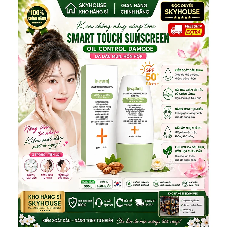 Kem chống nắng nâng tone SMART TOUCH SUNCREEN OIL CONTROL DAMODE chai 50ml da dầu mụn hỗn hợp chính hãng Hàn Quốc
