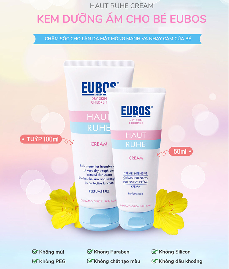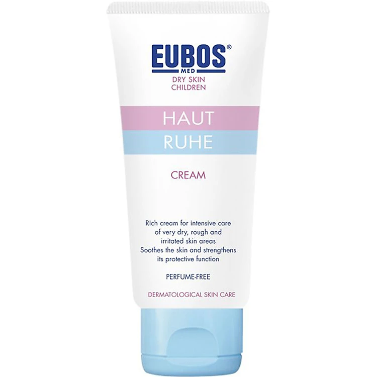 • Kem Dưỡng Toàn Thân Ngừa Chàm sữa, hăm cho trẻ em EUBOS Haut Ruhe Cream 50ml có dạng emulsion nước trong dầu, giàu dưỡng chất với dầu hoa anh thảo, phức hợp vitamin và chiết xuất từ ​​cỏ St.John đã được kiểm nghiệm lâm sàng an toàn để sử dụng cho làn da mỏng manh ở trẻ em và trẻ sơ sinh.