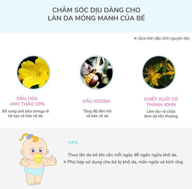 • Kem Dưỡng Toàn Thân Ngừa Chàm sữa, hăm cho trẻ em EUBOS Haut Ruhe Cream 50ml chứa 10% tinh dầu hoa anh thảo quý giá với các axit béo thiết yếu như axit linoleic và axit gamma-linolenic, thành phần quan trọng trong tăng cường "sức đề kháng" của da. Các dưỡng chất này giúp thúc đẩy và tăng cường chức năng bảo vệ tự nhiên của da đặc biệt hỗ trợ giảm thiểu các triệu chứng do viêm da dị ứng, viêm da cơ địa (chàm sữa) ở trẻ sơ sinh và trẻ nhỏ.