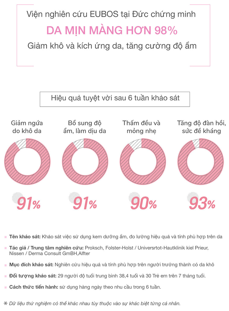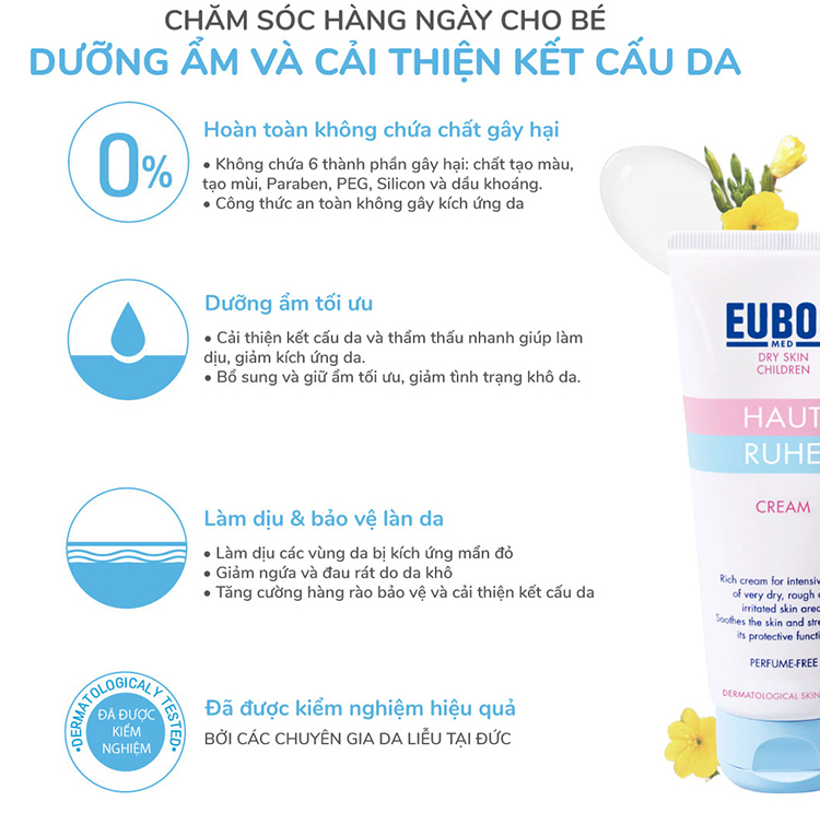 • Kem Dưỡng Toàn Thân Ngừa Chàm sữa, hăm cho trẻ em EUBOS Haut Ruhe Cream 50ml đã được thử nghiệm lâm sàng và chứng minh hiệu quả tại Khoa Da liễu Kiel (Đức).