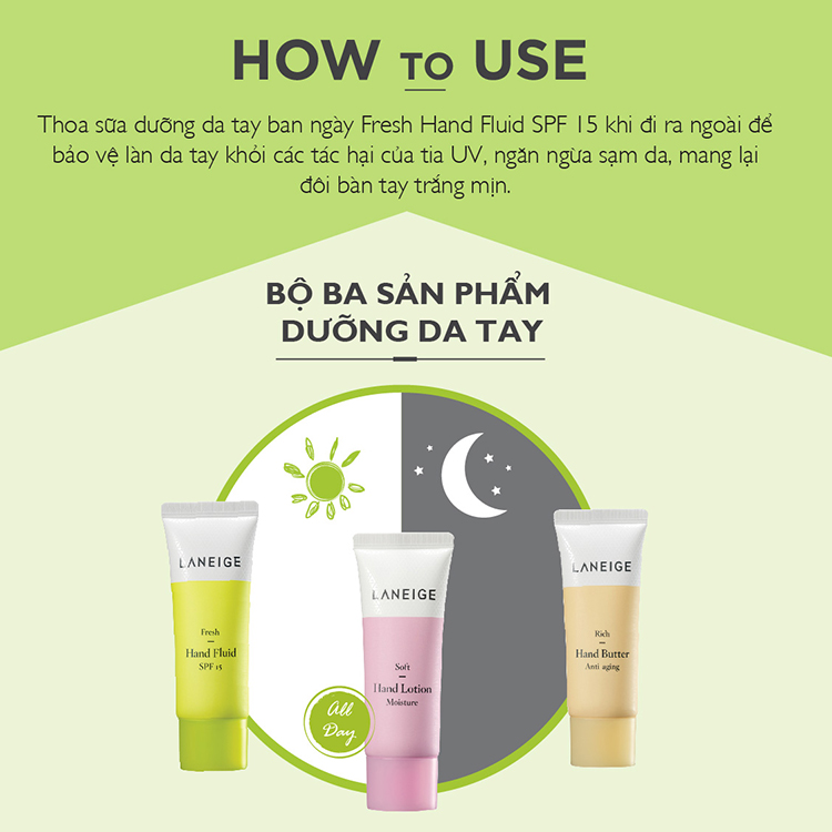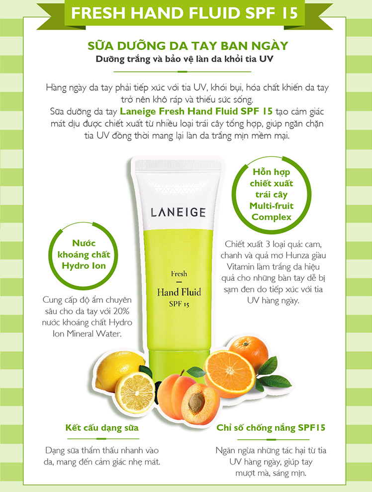 - Kem Dưỡng Dịu Mát Da Tay Dạng Lỏng Laneige Fresh Hand Fluid SPF15 tạo cảm giác nhẹ và mát được chiết xuất từ nhiều loại trái cây tổng hợp, có tính năng ngăn chặn tia tử ngoại đồng thời mang lại hiệu quả làm trắng da.