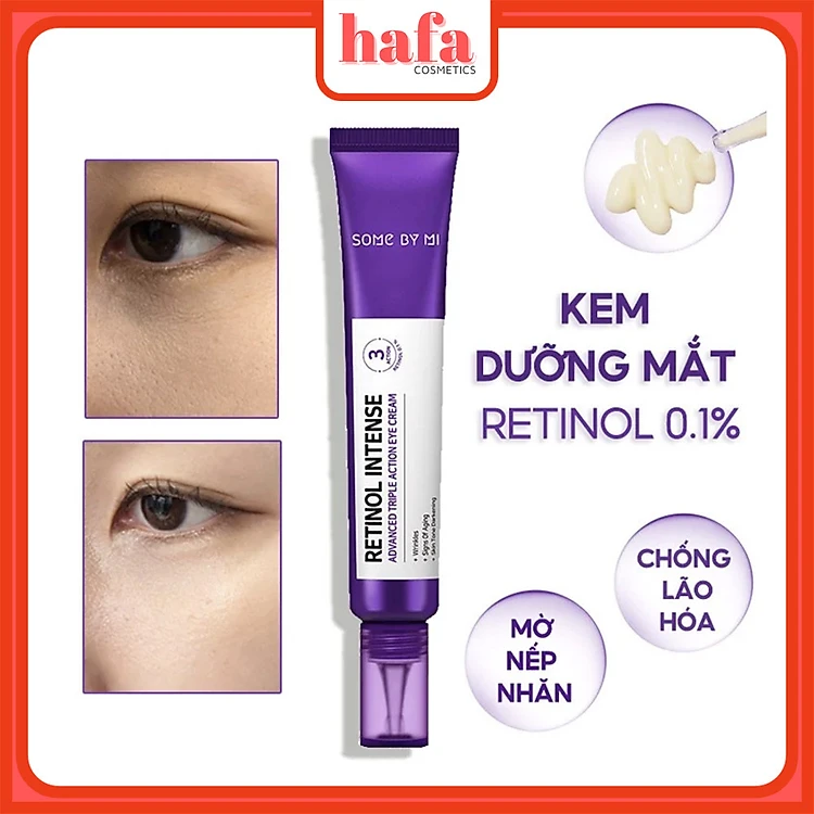 - Kem Dưỡng Mắt Mờ Quầng Thâm, Ngừa Lão Hóa Some By Mi Retinol Intense Advanced Triple Action Eye Cream giúp cải thiện nếp nhăn, làm sáng và săn chắc da. Đây là một giải pháp chăm sóc chống lão hóa toàn diện, có thể được sử dụng trên tất cả vùng da chùng nhão, chảy xệ nhiều nếp nhăn như mắt, trán, rãnh cười và cổ.