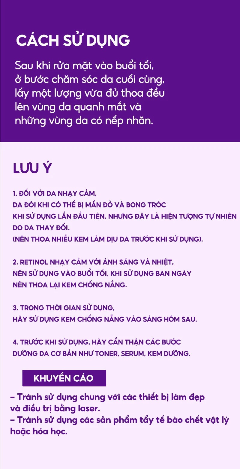 - Chứa 0.1% Retinol là một thành phần tuyệt vời giúp bình thường hóa các tế bào da và phục hồi làn da lão hóa về trạng thái tươi trẻ, các nếp nhăn nhỏ và độ đàn hồi đươc cải thiện, giúp da không bị sần và sáng hơn trước. ngăn ngua lão hóa sớm, làm chậm thời gian lão hóa da của da