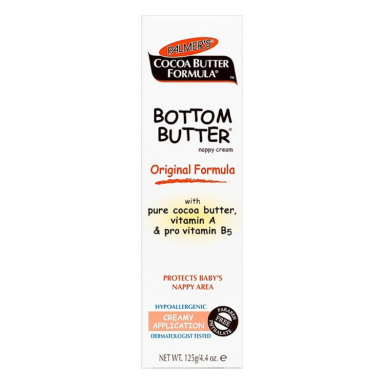 - Kem Hỗ Trợ Điều Trị Và Ngăn Ngừa Hăm Tã Cho Bé Palmer’s Cocoa Butter formula Bottom Butter Nappy Cream Original Formula PL4039 (125g) là sản phẩm hỗ trợ điều trị hiệu quả triệu chứng hăm tã làm bé khó chịu. Kem với công thức dịu nhẹ nhanh chóng đẩy lui tình trạng da mẩn đỏ, giảm đau rát, sưng tấy.