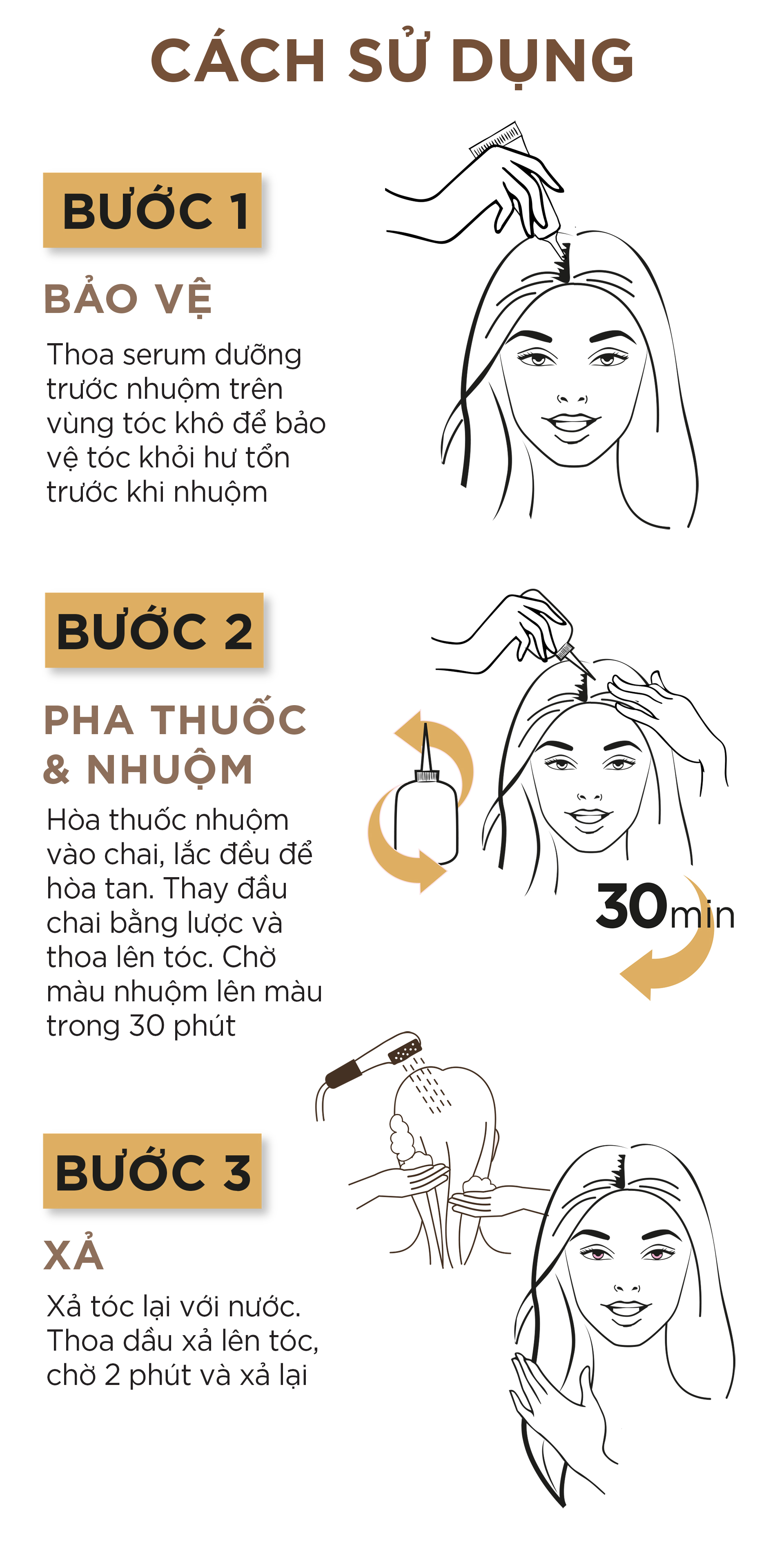 ● Thoa kem bảo vệ tóc sau khi nhuộm lên tóc và mát-xa nhẹ nhàng. Giữ nguyên trong 2 phút và gội sạch.