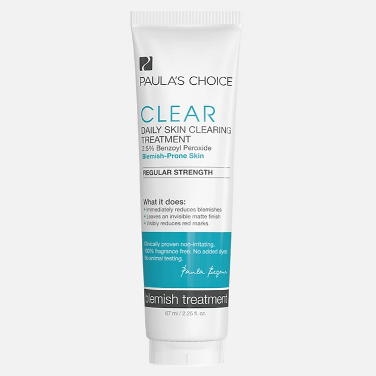 - Kem Hỗ Trợ Trị Mụn Paula's Choice Clear Regular Strength Daily Skin Clearing Treatment With 2.5% Benzoyl Peroxide (67ml) dạng lotion không chứa dầu cực kì dịu nhẹ sẽ giúp bạn điều trị những nốt mụn đang tồn tại và ngăn ngừa những nốt mụn mới trên mặt và body.