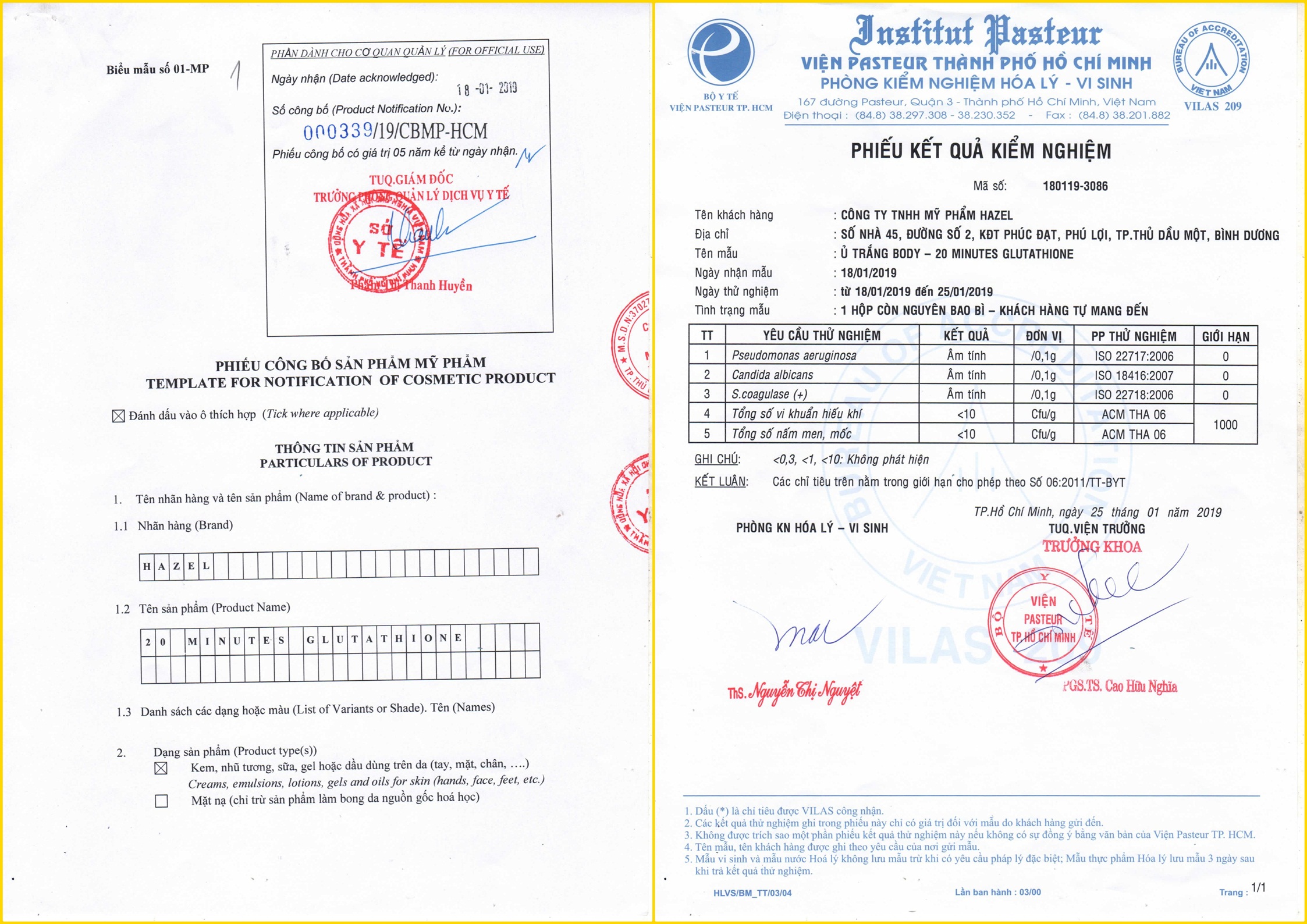 GIẤY CÔNG BỐ VÀ KIỂM NGHIỆN SẢN PHẨM KEM Ủ TRẮNG BODY CHUYÊN SÂU - 20 MINUTES GLUTATHIONE 250ML