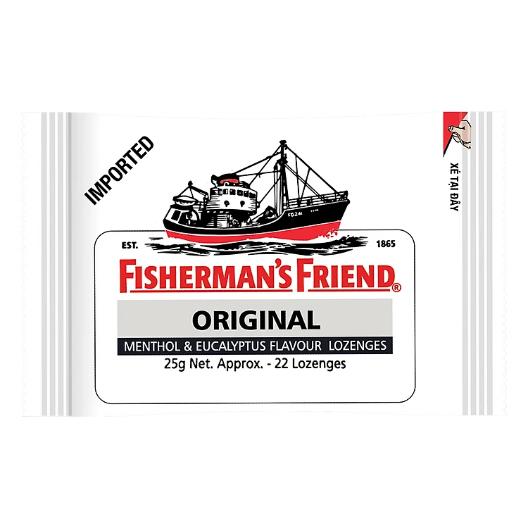 Kẹo Cay Con Tàu Fisherman's Friend Vị Khuynh Diệp Gói 25g vốn là kẹo ngậm do dược sĩ Fleetwood James Lofthouse bào chế cho ngư dân tại thị trấn Fleetwood để họ mang theo trong những chuyến đi biển đầy bão tố và giá lạnh tại ngư trường Bắc Đại Tây Dương. Kẹo cay được chiết xuất từ tinh dầu bạc hà và khuynh diệp, viên ngậm được sản xuất theo đúng công thức truyền thống, không sử dụng màu, mùi nhân tạo. Sản phẩm tốt cho sức khỏe, điều trị các bệnh nhiễm lạnh, cảm, sưng, viêm vòm họng.