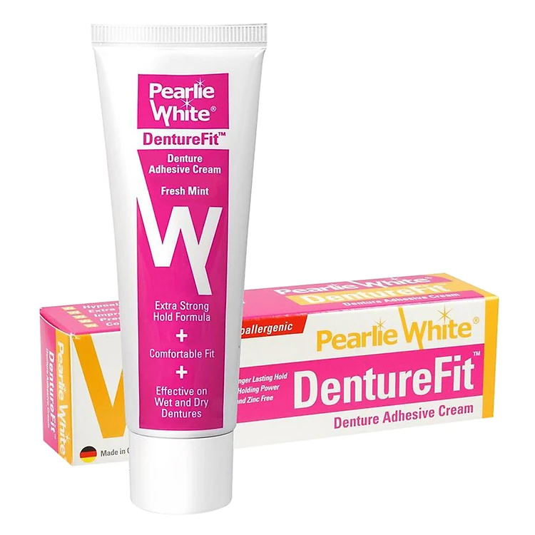 - Keo Dán Răng Giả Pearlie White keo dính chắc chắn giữ răng giả cố định giữa răng và nướu.