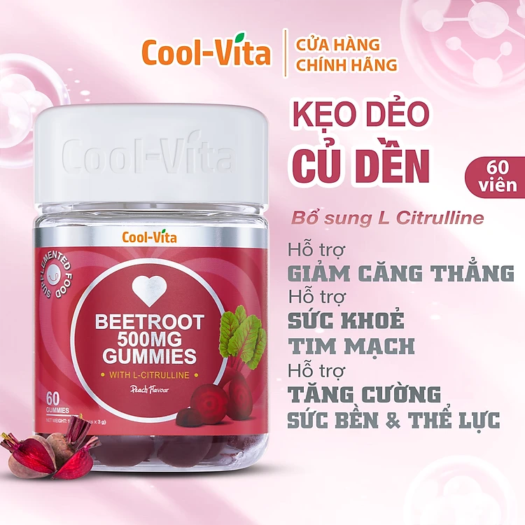 Kẹo Dẻo Củ Dền 500mg Hỗ Trợ Sức Khỏe Tim Mạch & Giúp Tăng Cường Sức Bền Vị Đào Kết Hợp L-Citrulline Coolvita (60 viên x 3g)/hộp