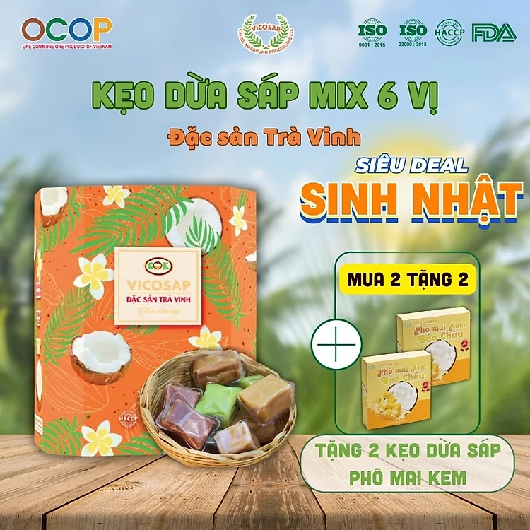 Kẹo dừa sáp VICOSAP mix 6 vị nguyên chất lá dứa cacao kẹo mềm dẻo ít đường đặc sản Trà Vinh