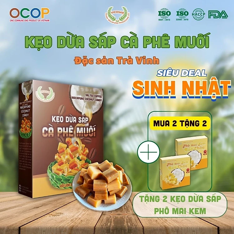 Kẹo dừa sáp VICOSAP vị cà phê muối kẹo mềm dẻo ít đường đặc sản Trà Vinh hộp 100g