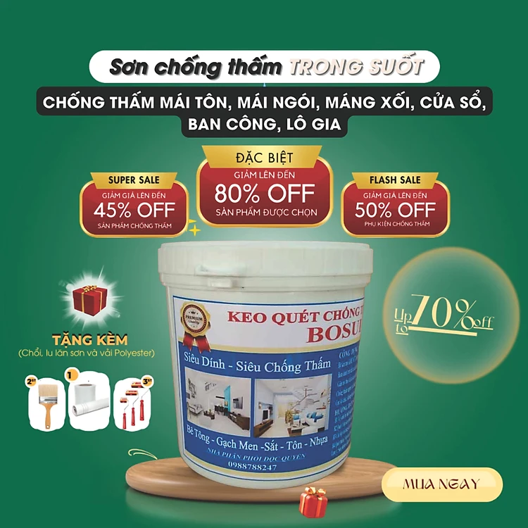 Keo Sơn Chống Thấm BOSUI Trong Suốt - Chống Thấm Nền Gạch, Nhà Vệ Sinh, Tường Nhà, Cửa Sổ, Gỗ Công Nghiệp(1 Kg) Tặng kèm chổi quét sơn và 2,5m vải