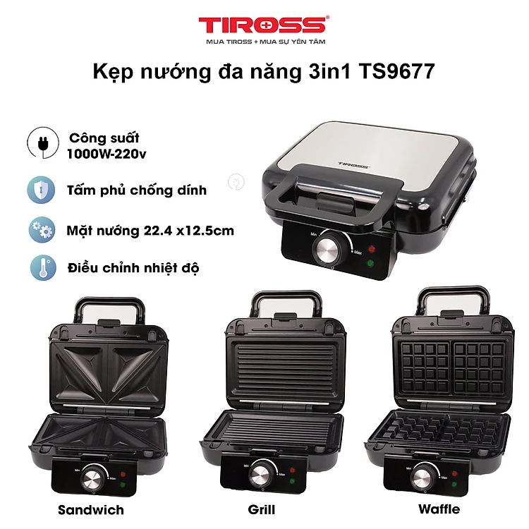 Kẹp nướng sandwich TIROSS 3 trong 1 TS9677 - Hàng chính hãng
