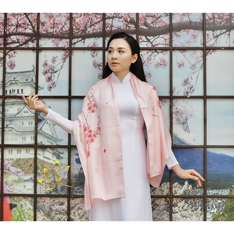 Khăn Choàng Cổ Lụa Cao Cấp Vẽ Hoa Đào SenSilk 180x55cm, Tơ Lụa Bảo Lộc Cao Cấp, Khăn Quấn Cổ Thời Trang Cao Cấp
