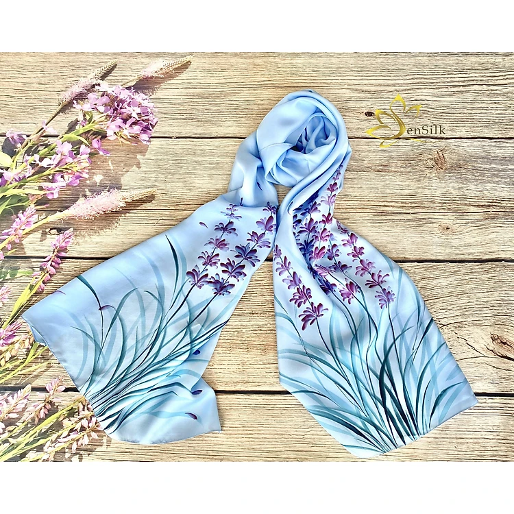 Khăn Choàng Cổ Lụa Vẽ Tay Lavender SenSilk 180x55cm, Quà Tết 2022, Khăn Quàng Cổ Cao Cấp