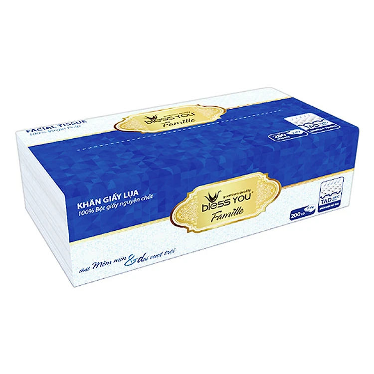 - Khăn Giấy Lụa Bless You Famille (200 Tờ) là Khăn giấy được làm từ 100% bột giấy nguyên chất. Sản phẩm giống như những chiếc khăn tay cá nhân, được sử dụng để thấm nước, lau mồ hôi, lau tay, lau chùi dầu mỡ, chén dĩa....
