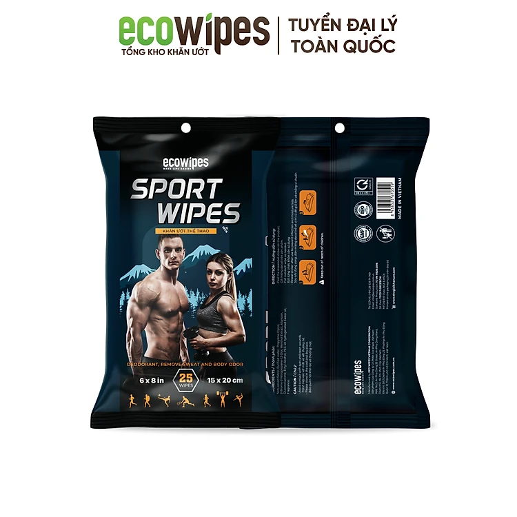 Khăn giấy ướt thể thao cao cấp EcoWipes gói 25 tờ lau mồ hôi làm mát cơ thể khử mùi nhanh chóng cho vận động viên