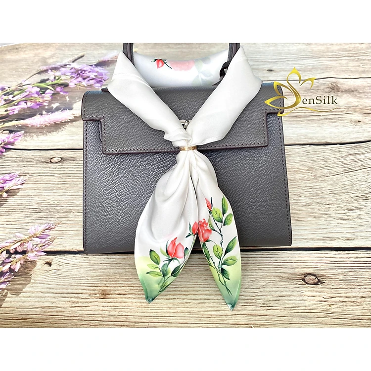 Khăn Lụa Quấn Túi Cao Cấp Vẽ Tay Hoa Hồng SenSilk, Khăn Lụa Tơ Tằm Quấn Cổ Thắt Nơ 55x55cm